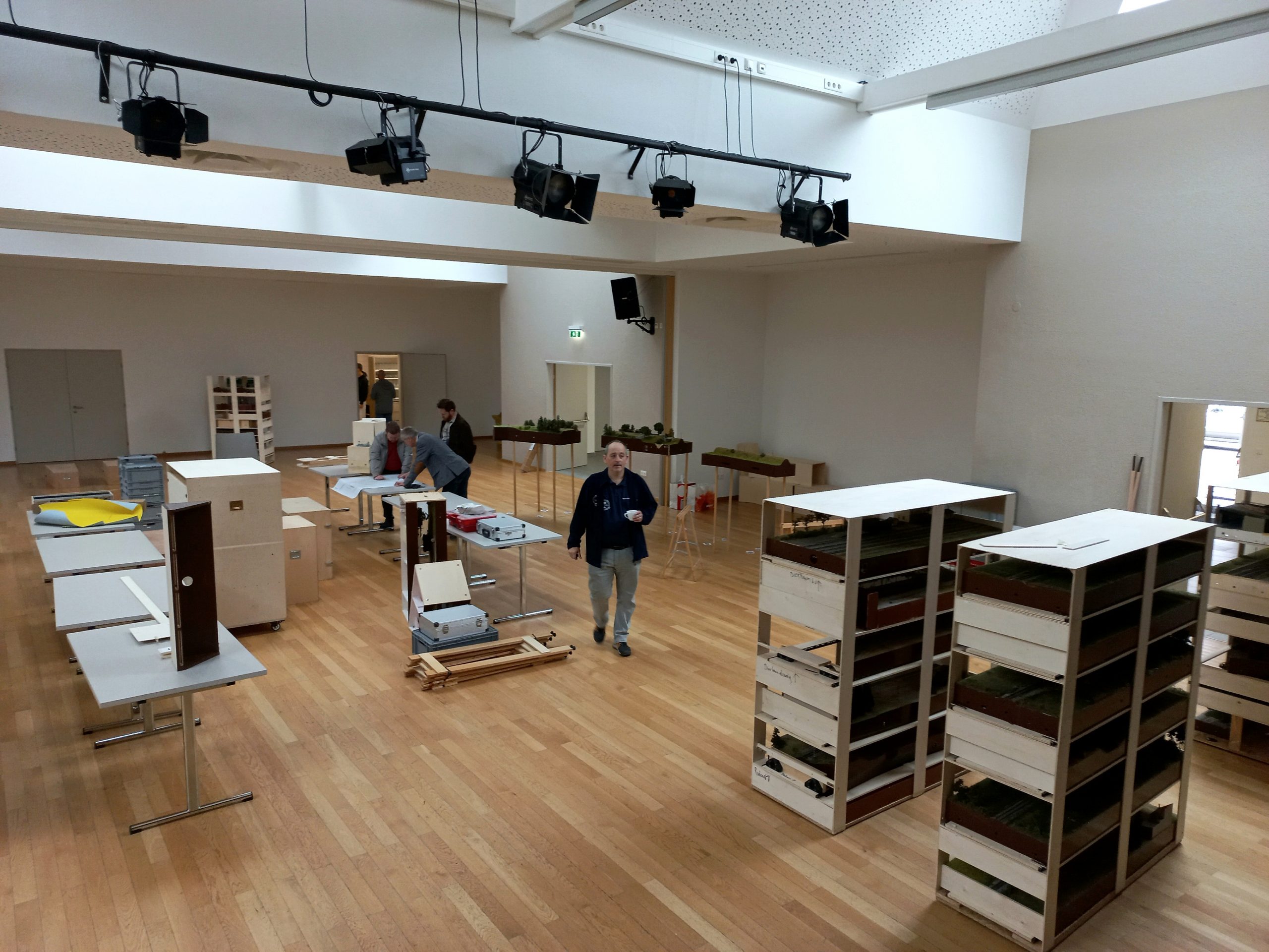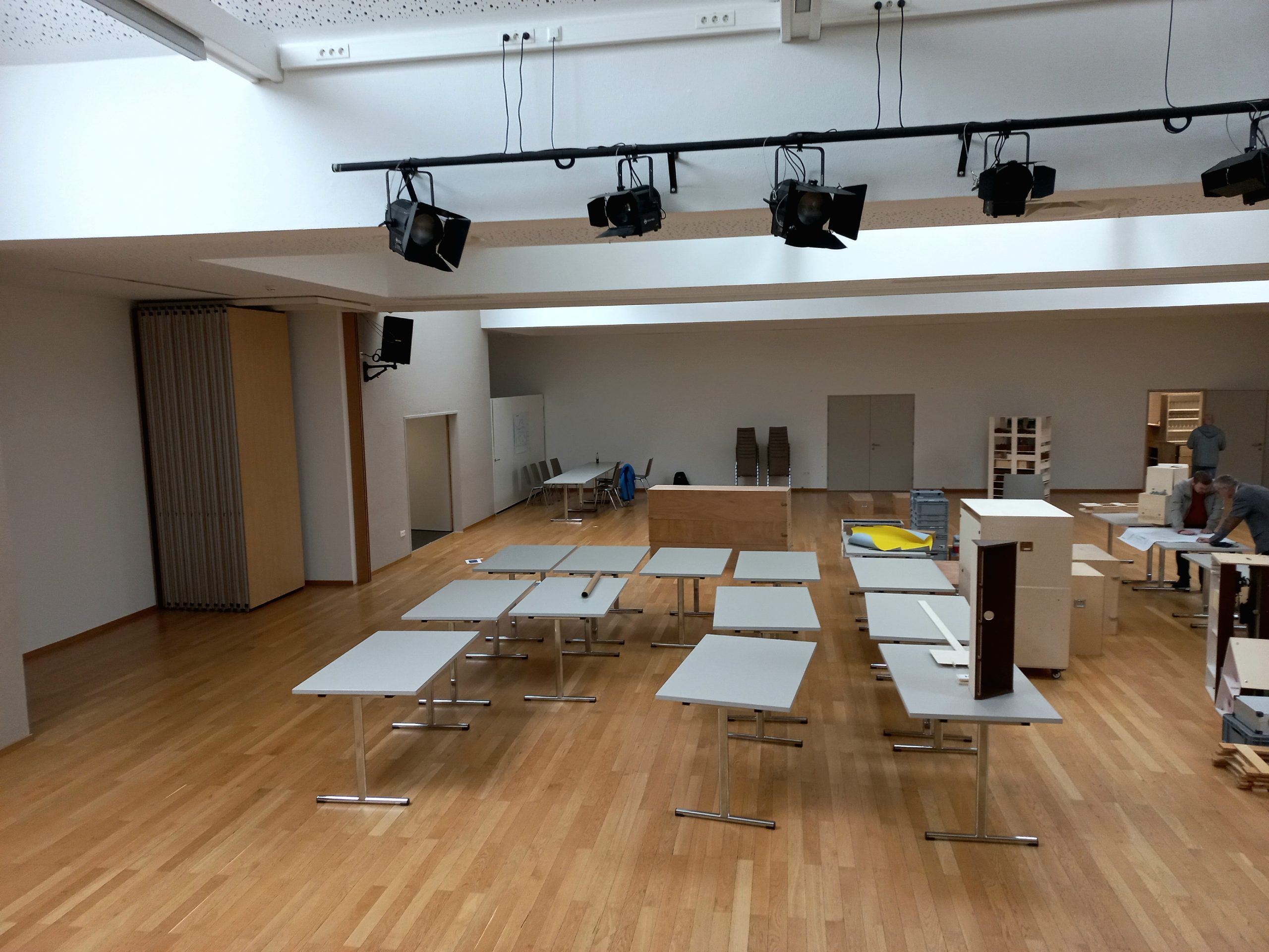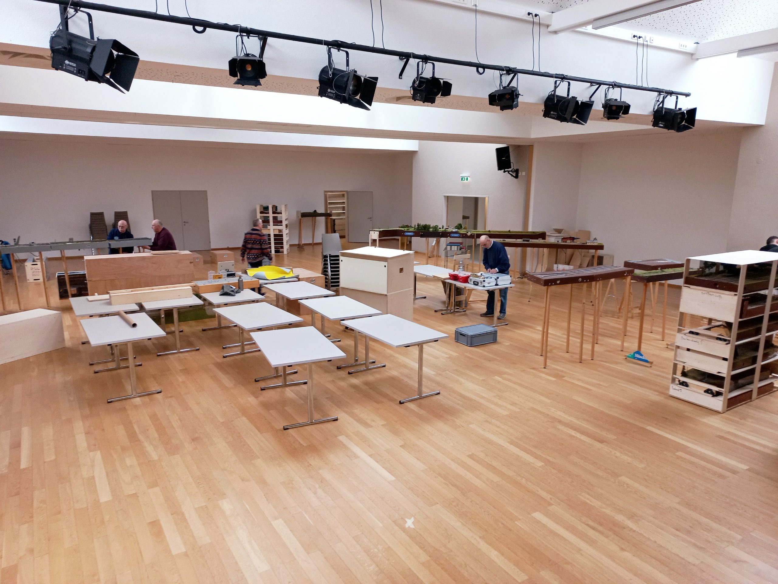 Und wieder gilt es, ein leere Halle – anfänglich standen dort nur 22 Tische, die die Gemeinde-Mitarbeiter für uns aufgebaut hatten – mit Modulen zu füllen … am Donnerstag beginnt ein scheinbares Chaos