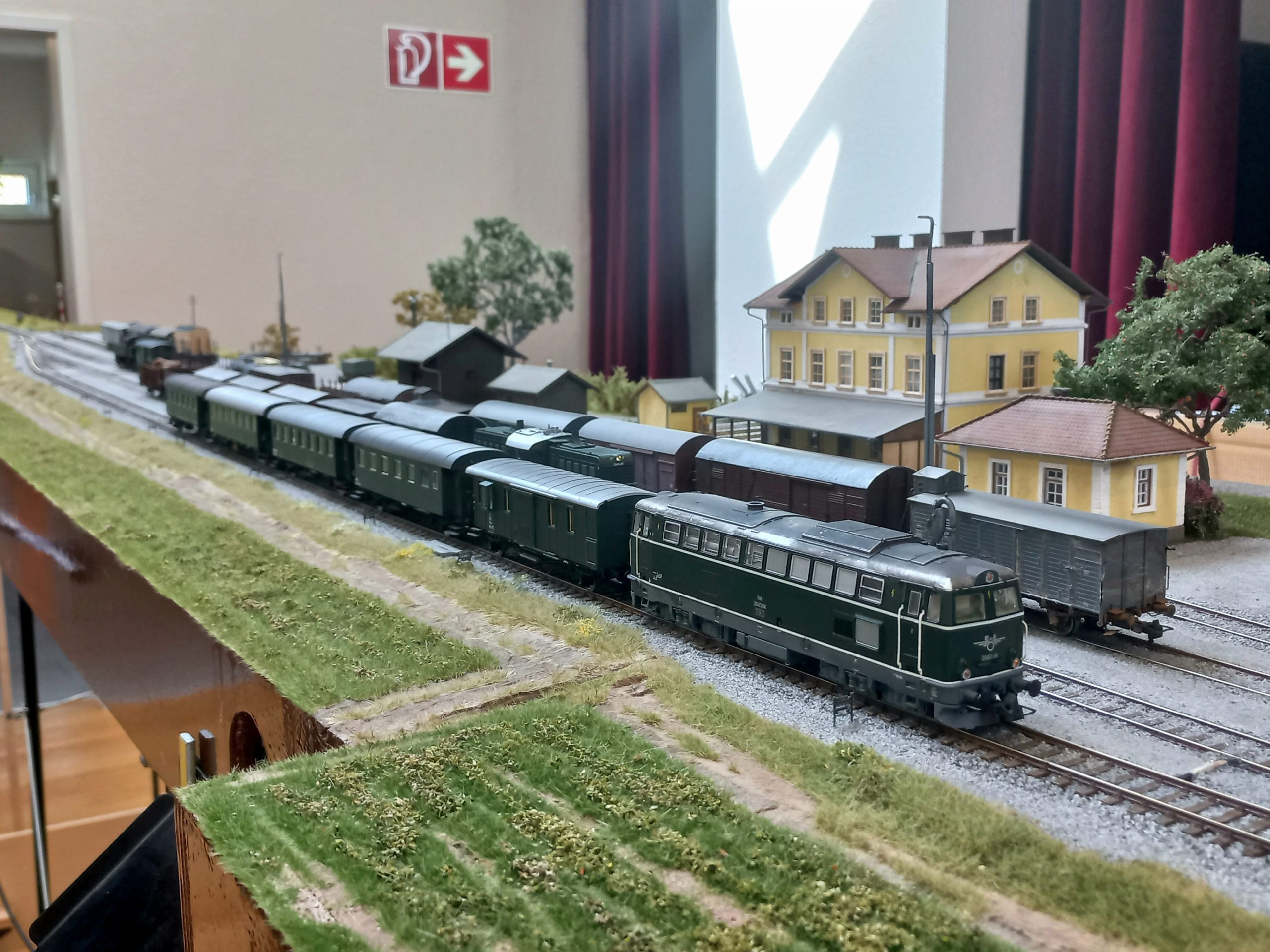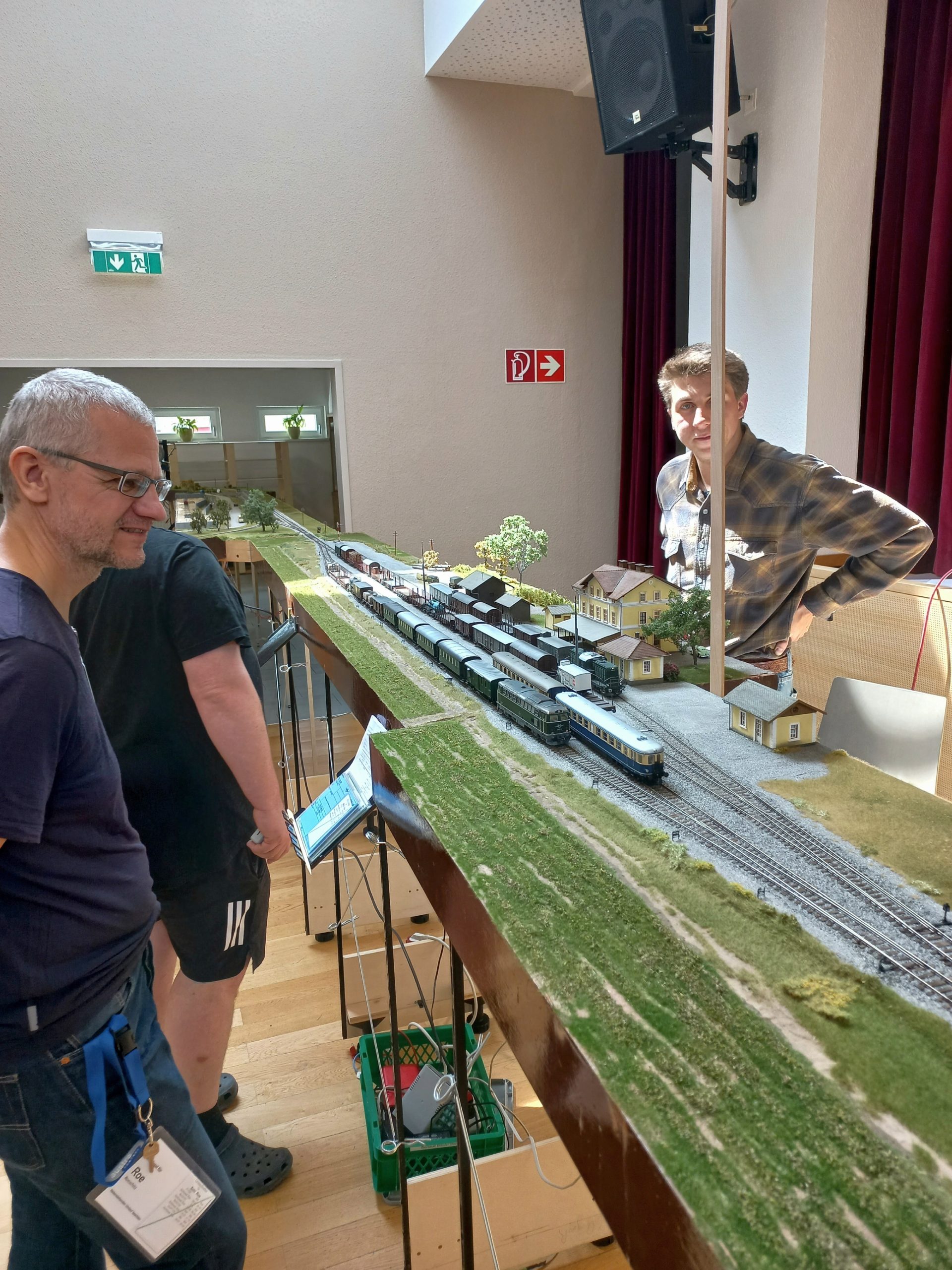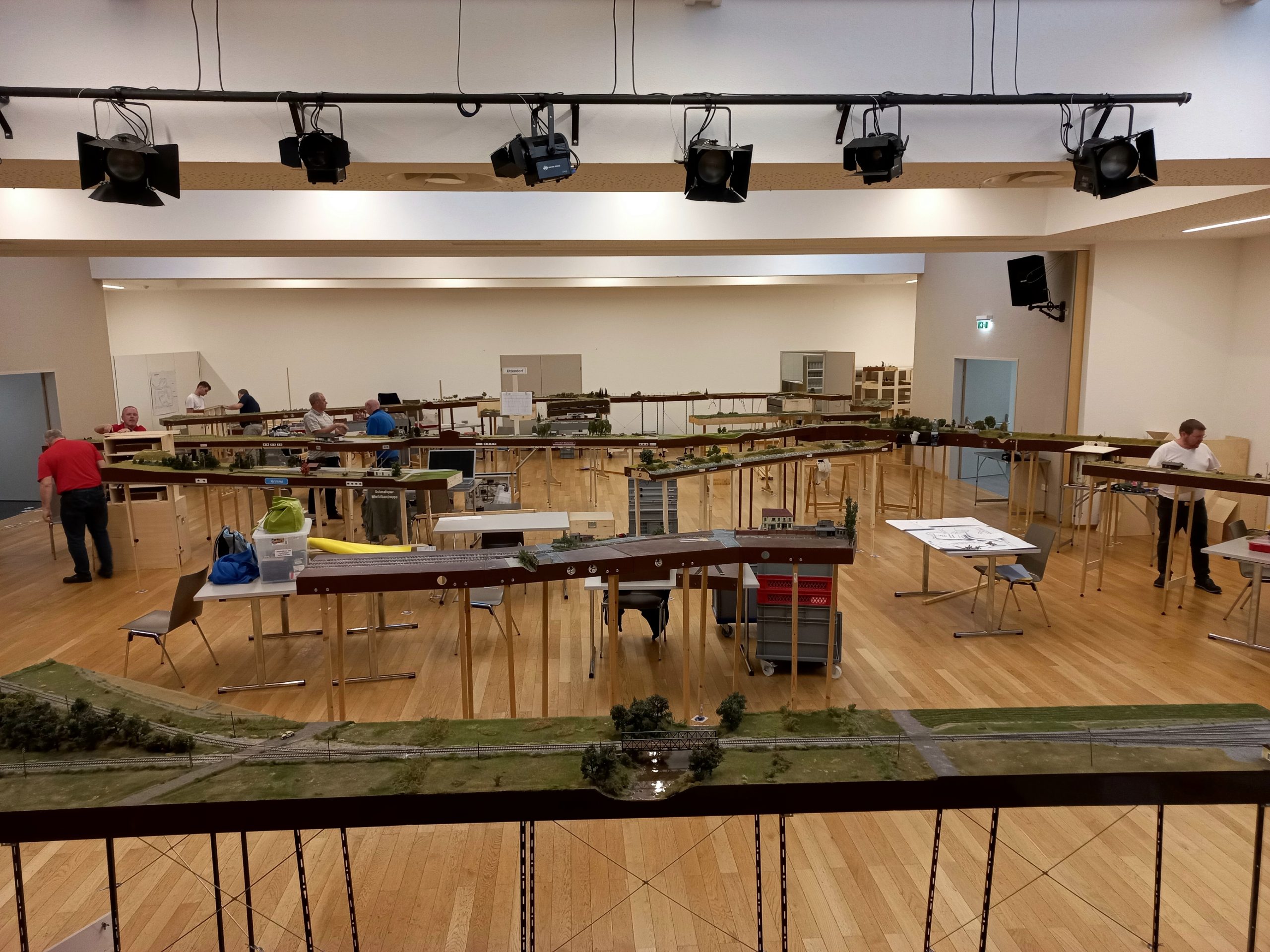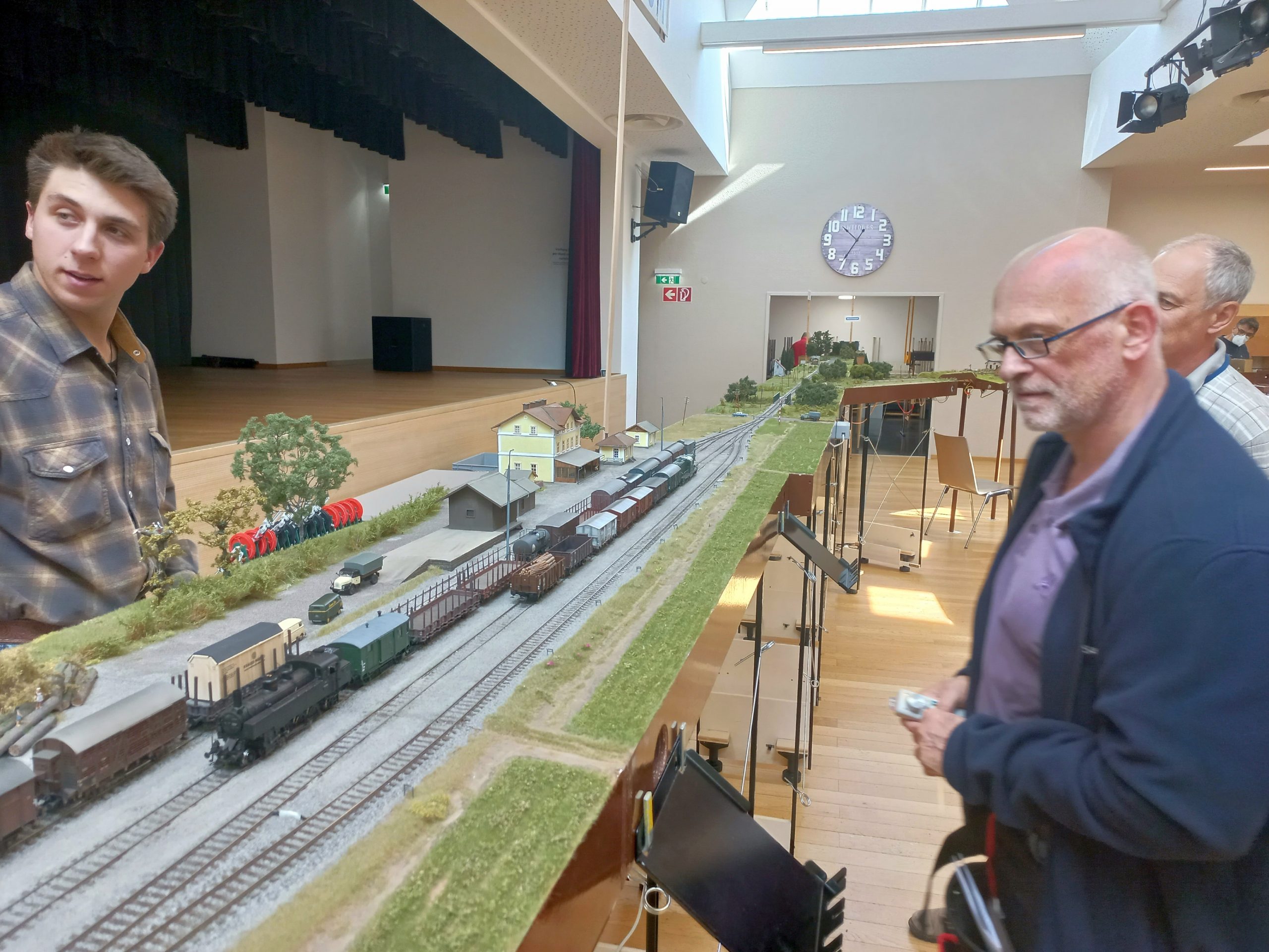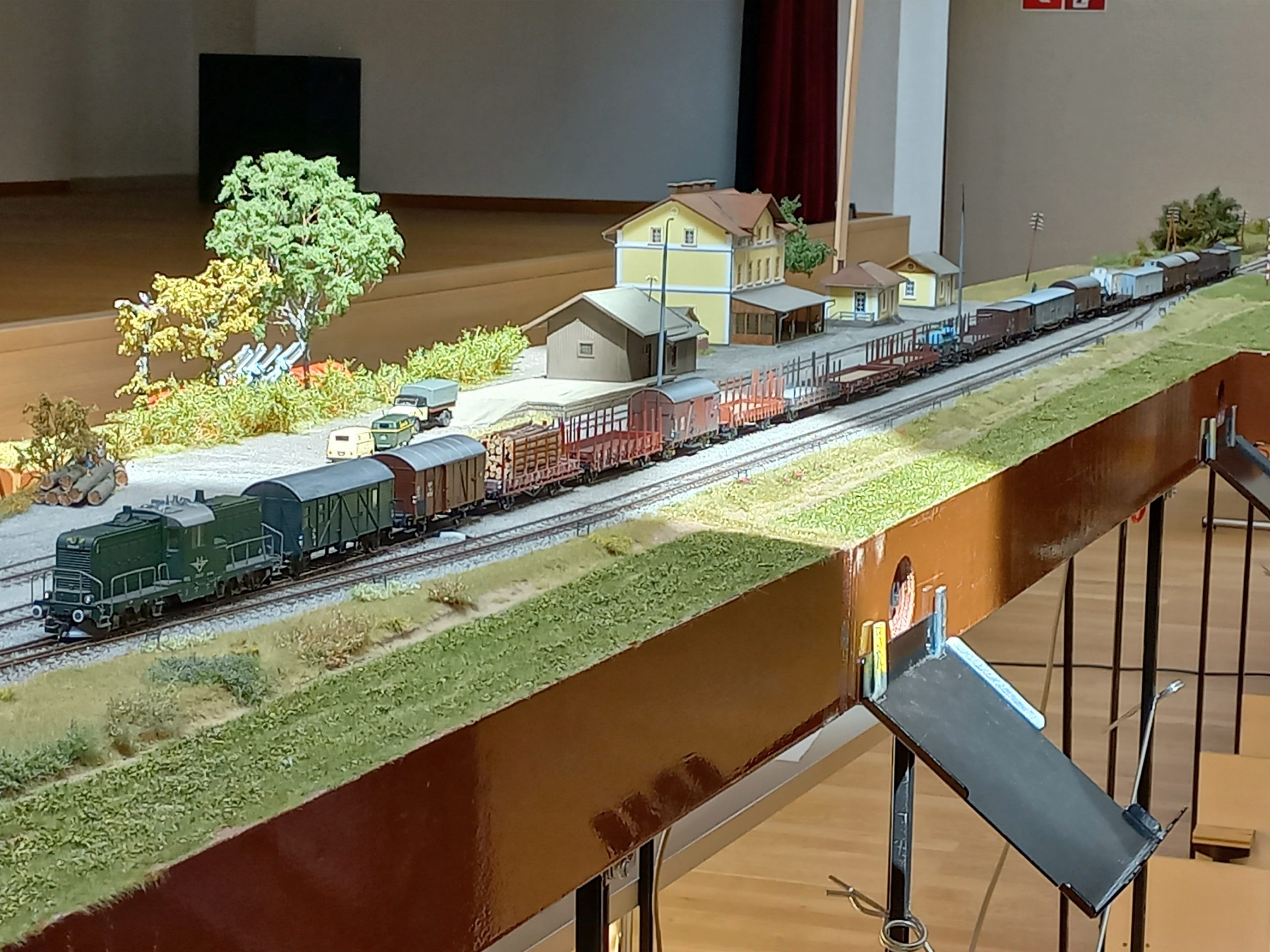Wie bereits vorher sieben Male waren wir wieder „Gäste“ in der Ortszentrum-Halle (in zwei Jahren mussten wir in die Turnhalle der Volksschule ausweichen). Das Schöne war, dass es nicht nur das zehnte Treffen war, sondern wir diesmal auch Verstärkung durch die Schmalspurbahner bekommen haben, die den zur Verfügung stehenden Raum bestens ausgefüllt hatten. Eine – wie ich finde – gelungene Kombination. So wurde bei der Normalspur ein Endbahnhof im Arrangement ersetzt durch eine Übergabe zur Schmalspur, und die normalspurigen Güterwagen konnten aus Rollwagen den weiteren Weg zu ihren Zielen zurücklegen (und es gab klarer weise auch Schmalspurzüge ohne Rollwagen).