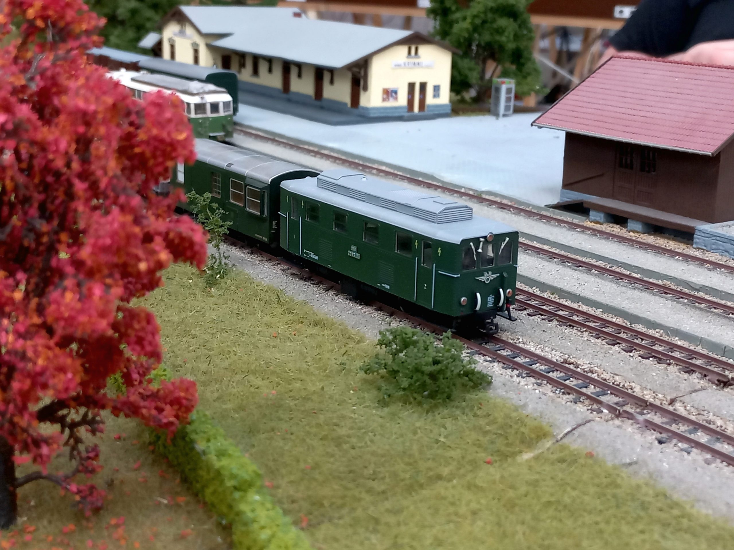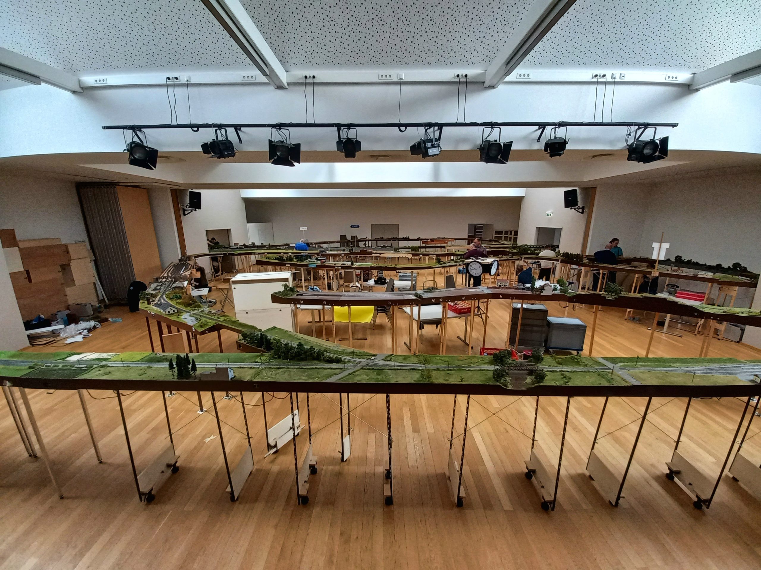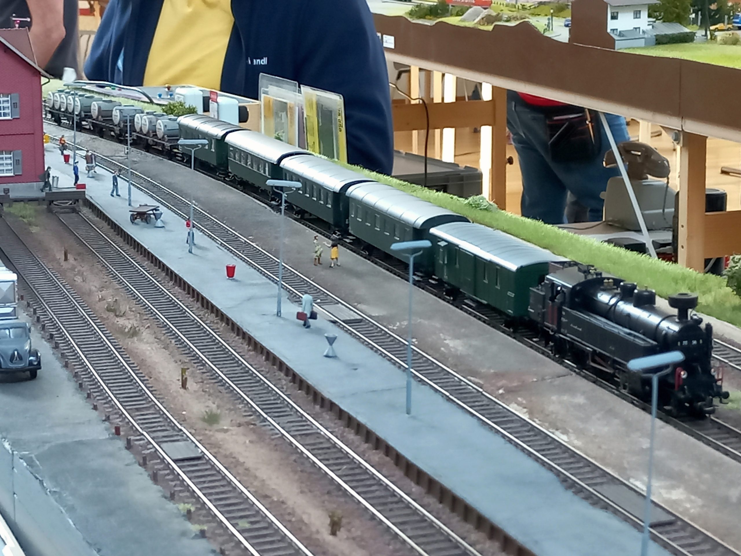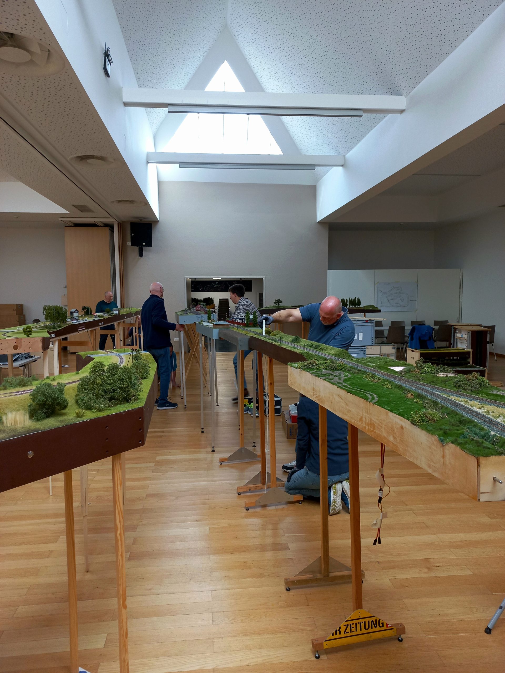 Wie bereits vorher sieben Male waren wir wieder „Gäste“ in der Ortszentrum-Halle (in zwei Jahren mussten wir in die Turnhalle der Volksschule ausweichen). Das Schöne war, dass es nicht nur das zehnte Treffen war, sondern wir diesmal auch Verstärkung durch die Schmalspurbahner bekommen haben, die den zur Verfügung stehenden Raum bestens ausgefüllt hatten. Eine – wie ich finde – gelungene Kombination. So wurde bei der Normalspur ein Endbahnhof im Arrangement ersetzt durch eine Übergabe zur Schmalspur, und die normalspurigen Güterwagen konnten aus Rollwagen den weiteren Weg zu ihren Zielen zurücklegen (und es gab klarer weise auch Schmalspurzüge ohne Rollwagen).