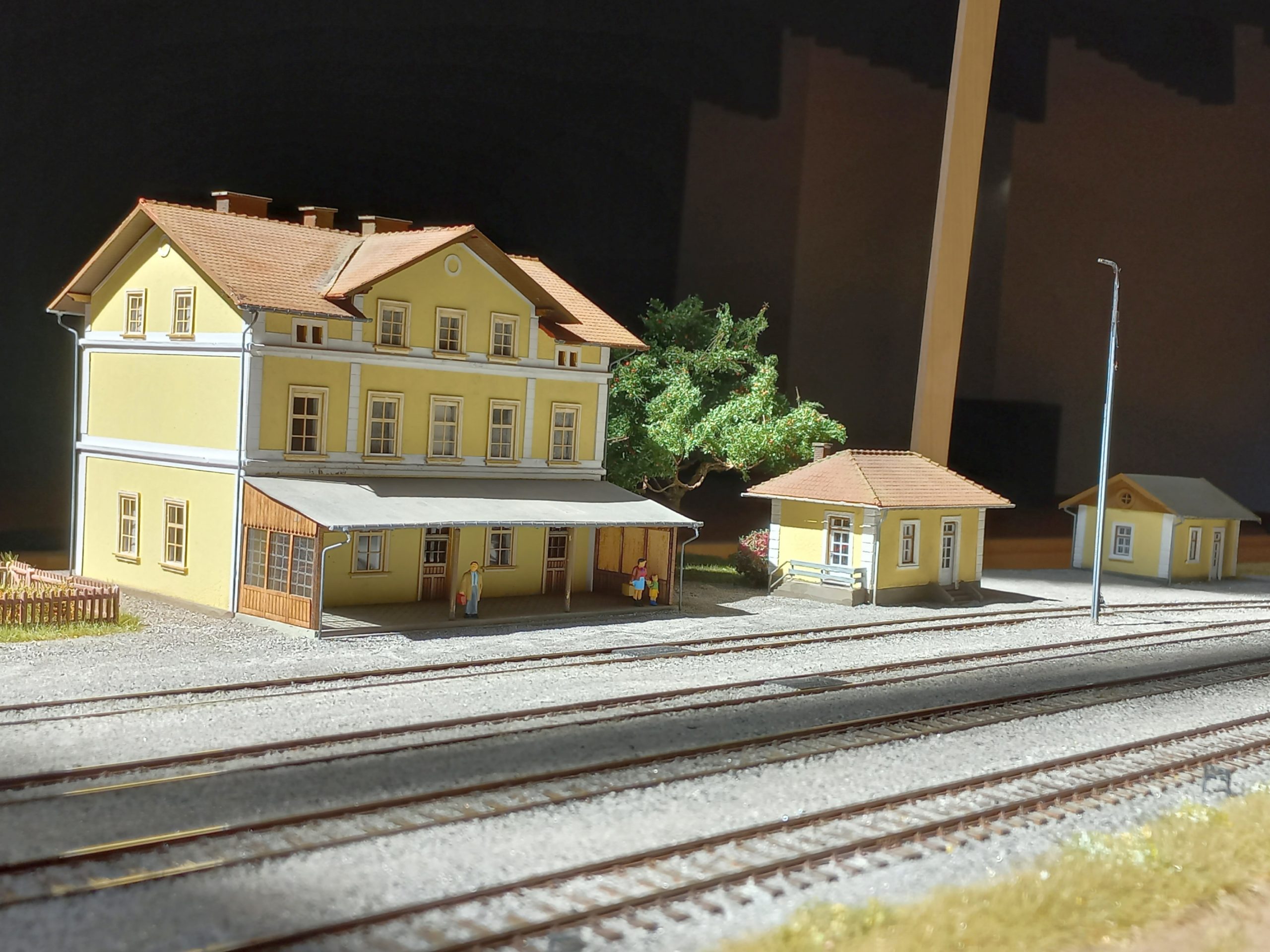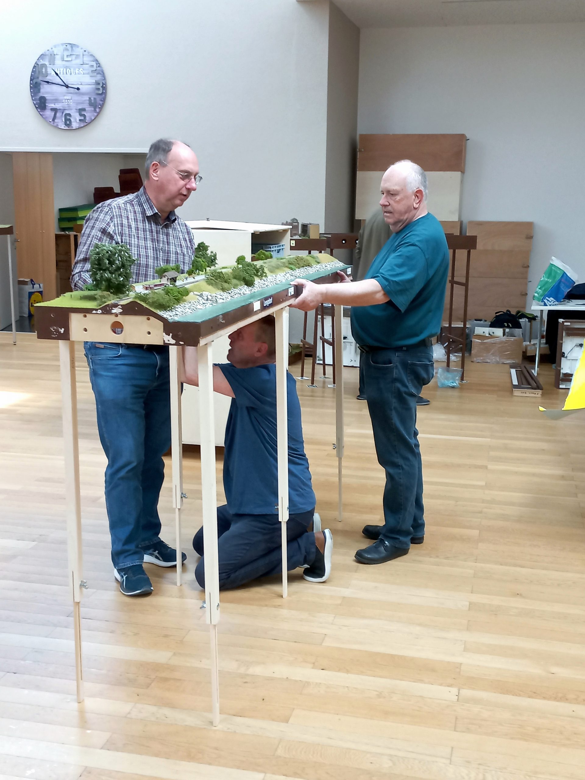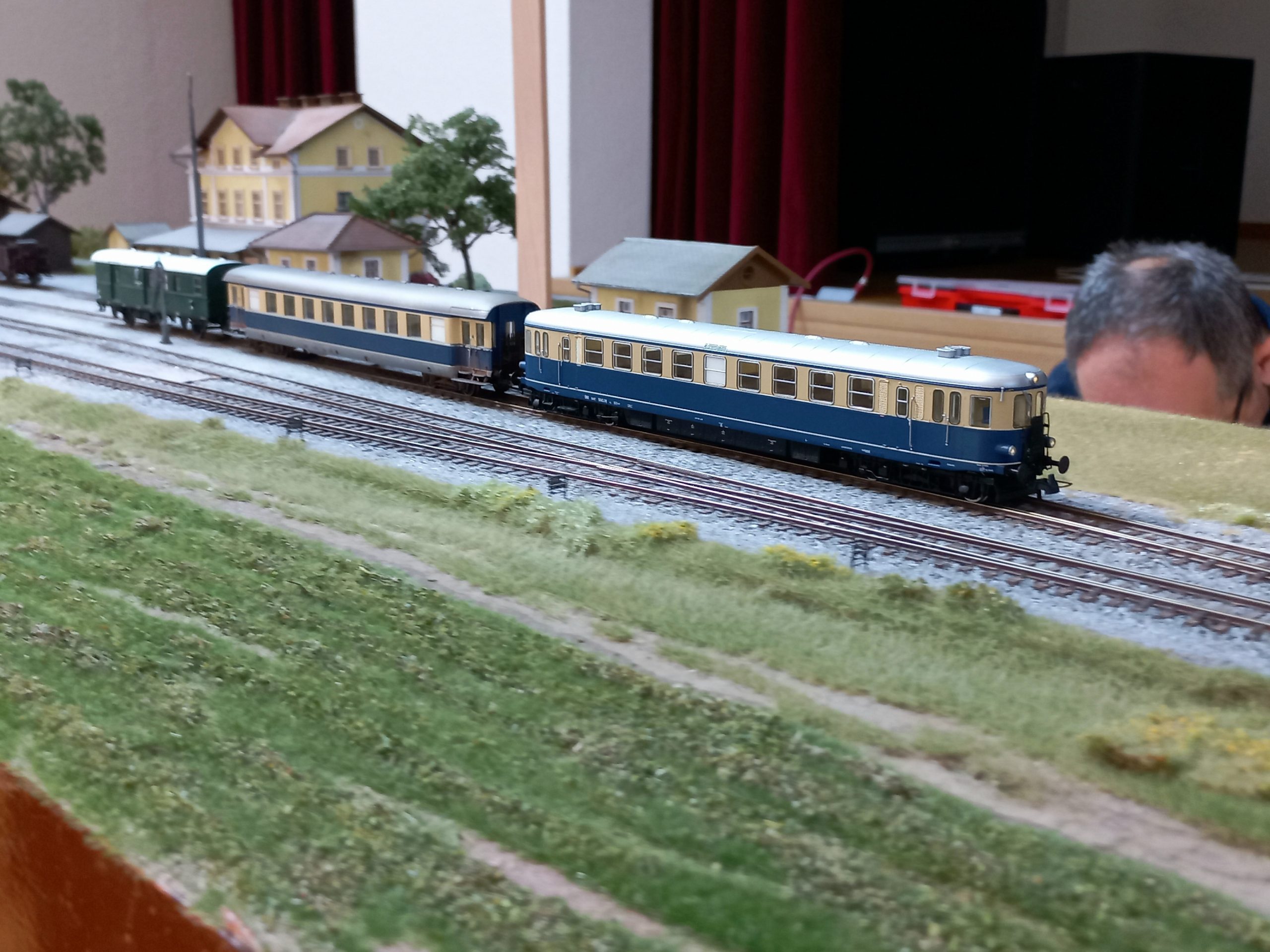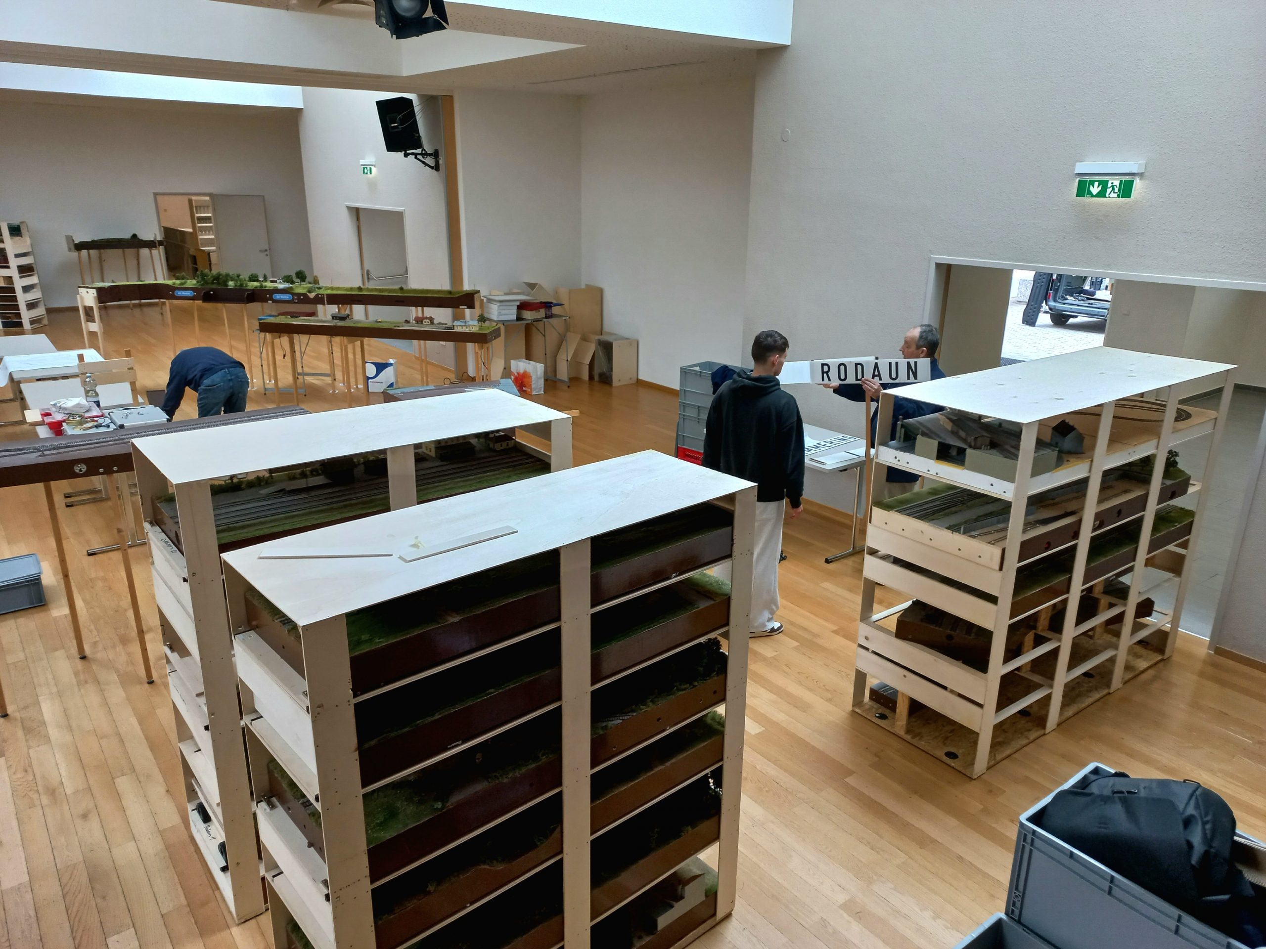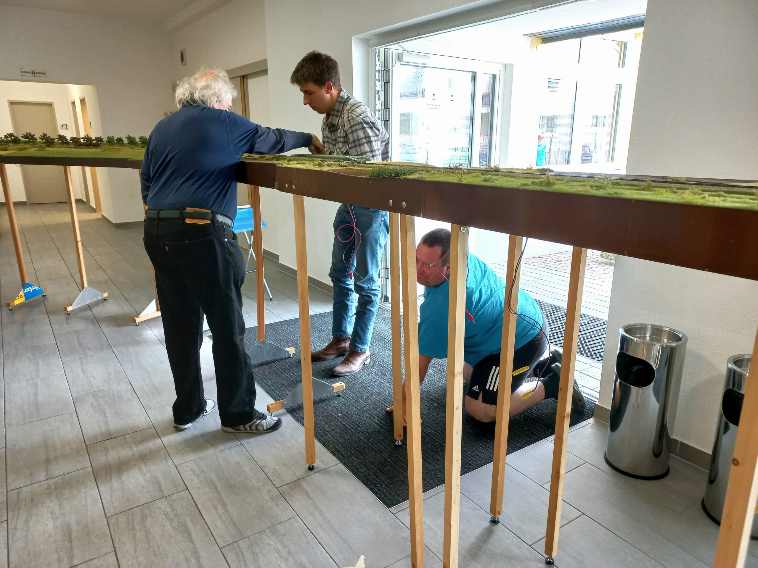 Wie bereits vorher sieben Male waren wir wieder „Gäste“ in der Ortszentrum-Halle (in zwei Jahren mussten wir in die Turnhalle der Volksschule ausweichen). Das Schöne war, dass es nicht nur das zehnte Treffen war, sondern wir diesmal auch Verstärkung durch die Schmalspurbahner bekommen haben, die den zur Verfügung stehenden Raum bestens ausgefüllt hatten. Eine – wie ich finde – gelungene Kombination. So wurde bei der Normalspur ein Endbahnhof im Arrangement ersetzt durch eine Übergabe zur Schmalspur, und die normalspurigen Güterwagen konnten aus Rollwagen den weiteren Weg zu ihren Zielen zurücklegen (und es gab klarer weise auch Schmalspurzüge ohne Rollwagen).