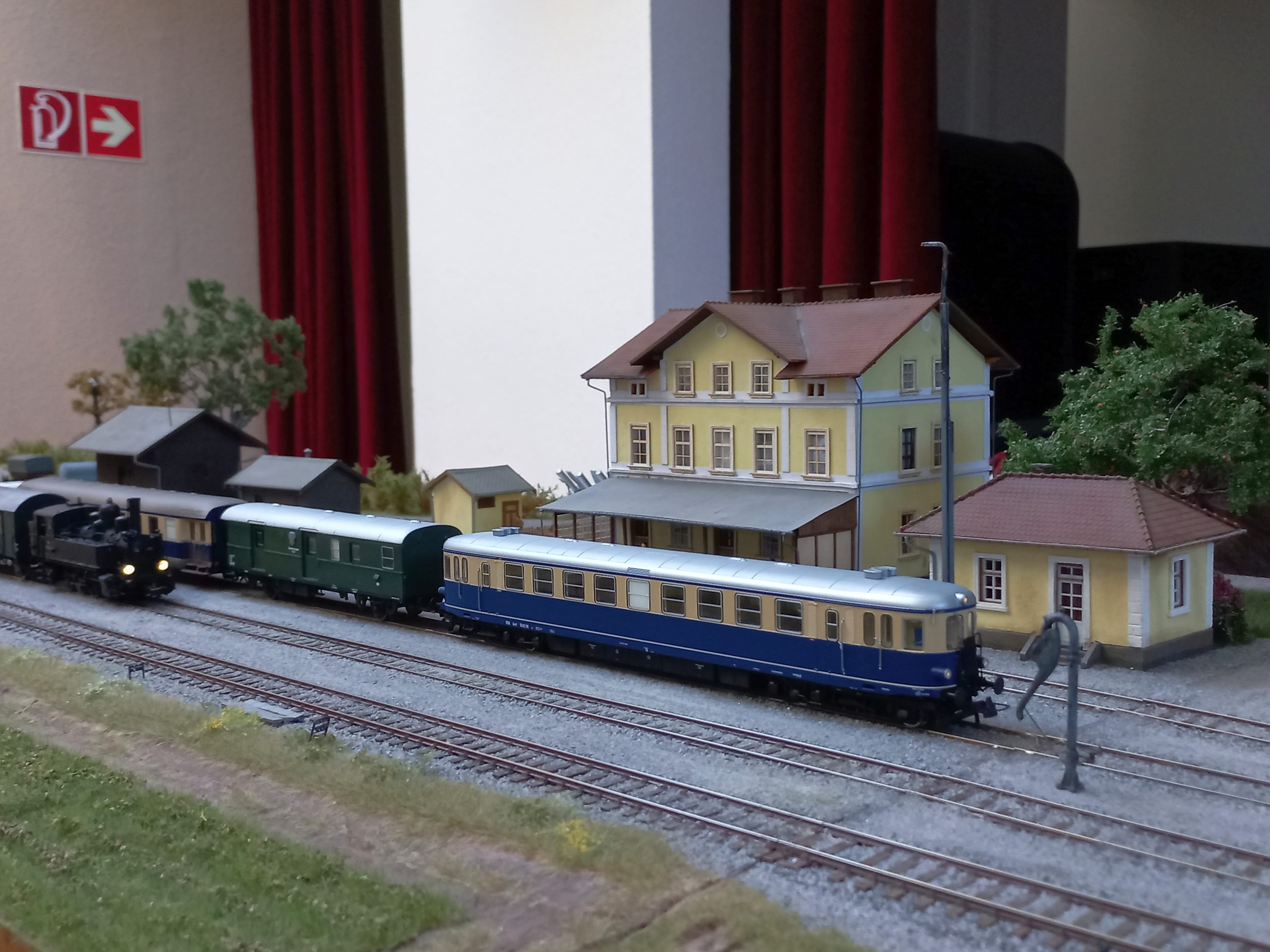 In Bierbaum überholt der Eiltriebwagen (mit zusätzlichem Bahnpostwagen) nach Unsmarkt morgens den Bezirksgüterzug